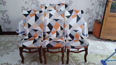 Paket: Şəkillərdə bir ədəd klassik naxışlı stul və üzərində rəngli elastik örtüklər olan bir neçə stul görünür.