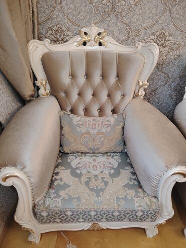 – Material: krem rəngli laklı massiv (ağac) karkas, yumşaq məxmər tipli parça arxa və qol hissələrində, oturacaq və yastıqlarda naxışlı jacquard parça