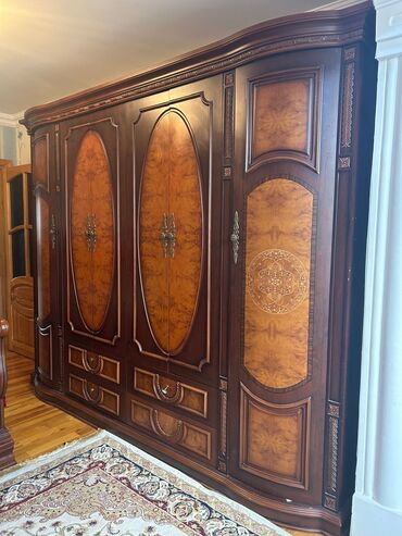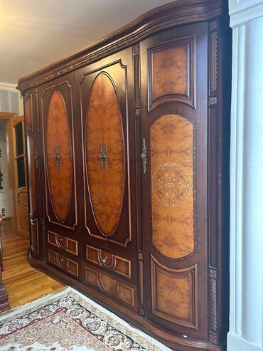 - 5 qapılı iri qarderob (üst hissədə dairəvi formalar, dekorativ oyma elementlər, mis rəngli furnitura)