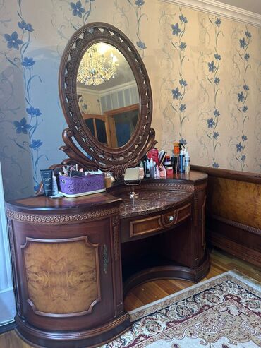 - Geniş güzgülü makiyaj masası/komod (ovuclu oval güzgü, iki yan bölmə, çoxsaylı çekmecələr)
