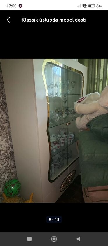 - Vitrin şkaf: Şüşə qapılı, içəridə üç rəf; konturları və çərçivəsi qızılı dekorla vurğulanıb. Aşağı hissədə klassik ornamentli dekor paneli var.