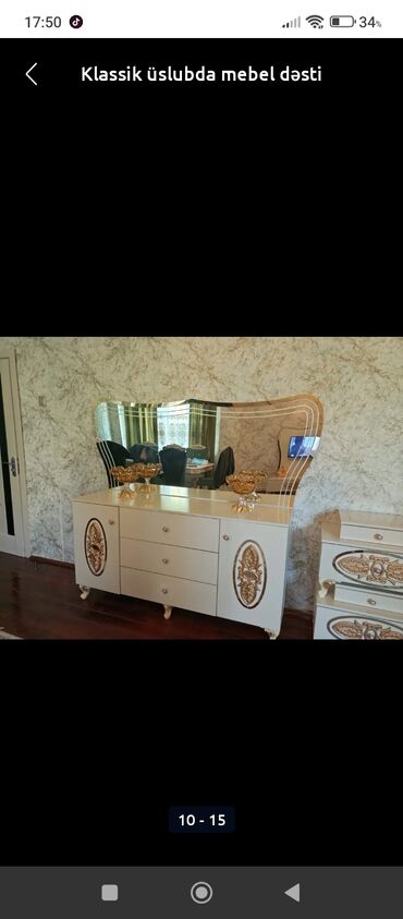 - Konsol-komod güzgü ilə: Ortada 3 çekmece, sağ və solda qapalı bölmələr; üstündə iri, dalğalı formalı güzgü. Fasadda qızılı relyef naxışlar və dekorativ tutacaqlar.