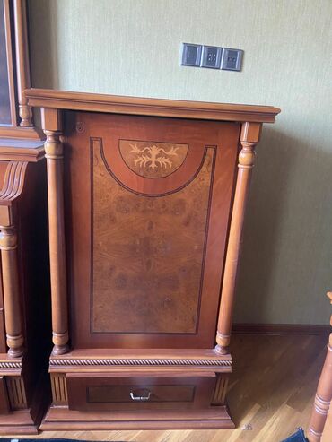 - Dəstdə əlavə şkaf/komod elementləri: sütunvari yan panellər, aşağıda çekmece, ön fasadda intarsiya və oyma bəzəklər.