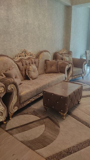 - Komplekt: 3 yerlik divan, 2 ədəd kreslo, üzərində şüşə səthli pouf/çay masası, dekorativ yastıq dəsti.