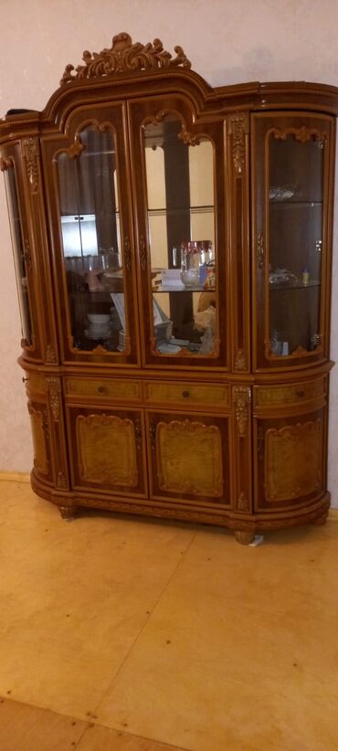 - Üst hissə: dörd qapılı şüşə vitrin (əyri konturlar), içəridə şüşə rəflər; arxa hissə güzgülü