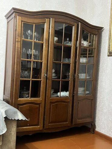 Klassik üslubda şkaf-vitrin - Material: massiv ağac və MDF kombinasiyası, zəngin qəhvəyi rəng, dərin oymalar və dekorativ relyeflər - Ön hissə: şüşəli üç qapı – içərisi vitrin kimi, qab-qacaq və a...