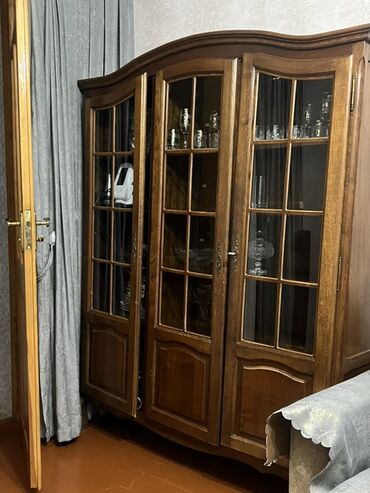 Klassik üslubda iri vitrinali bufet - Material: təbii ağacdan (oyma dekorlu), rəngi qoz tonlarında - Üst hissə: üç şüşəli vitrin bölməsi, hər bölmədə şüşə rəflər; yan tərəflərdə də şüşəli vitrində...