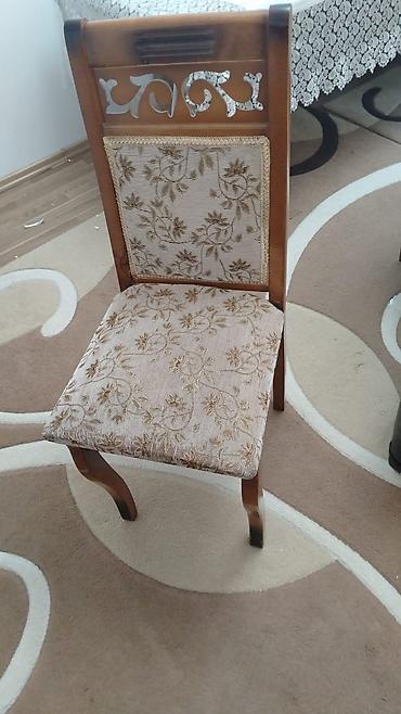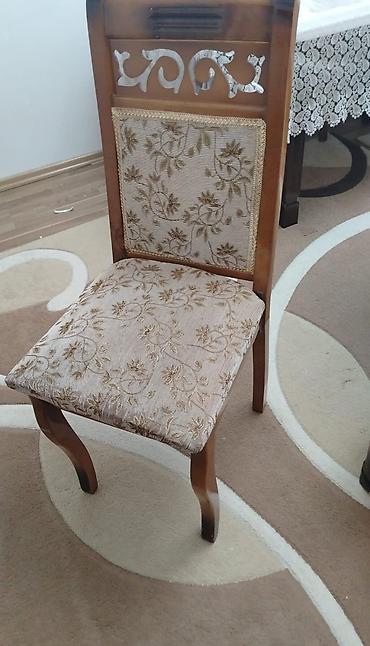- Stul(lar): taxta karkas, kürək hissəsində dekorativ naxışlı metal elementlər; oturacaq və arxa hissə çiçək naxışlı bej rəngli parça ilə üzlənib. Ön ayaqlar klassik qıvrım formadadır, oturuşu rahatdır.