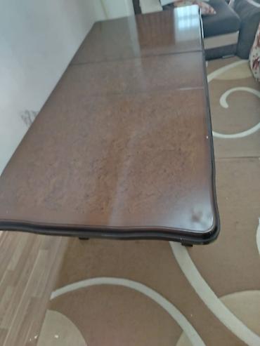 - Masa: düzbucaqlı forma, tünd-qəhvəyi taxta üstlük, yumşaq radiuslu kənarlar, dörd massiv kvadrat formalı ayaq. Geniş ailə süfrələri üçün rahat ölçü; səth lak örtüklüdür, təmizlənməsi asandır.