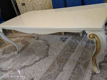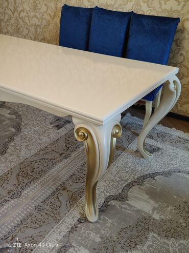 - Masa: Parlaq krem/ağ rəngli üst səth, yumşaq radiuslu kənarlar. Oymalı, barokko motivli qıvrımlı ayaqlar – krem rəng üzərində qızılı vurğularla. Stabil konstruksiya, geniş oturma sahəsi (ailə və qonaqlar üçün ideal).