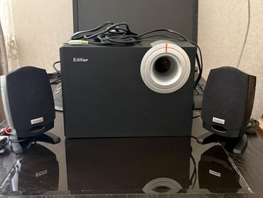 - Edifier 2.1 səs sistemi: subwoofer və iki peyk akustikası, 3.5 mm audio giriş, korpus üzərində idarəetmə.