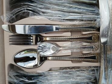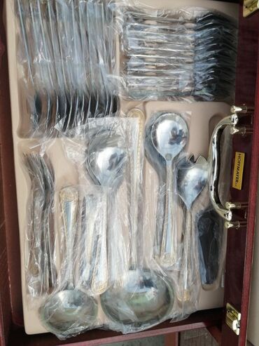 Almaniyadan alınıb.Brend mağazadan.Təmiz polad.1qutuda 1çay qaşığı q xörək qaşığı 1 çəngəl 1 bıcaq var.Arxa tərəfində zavodun möhürü var.30 avroya alınıb