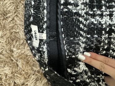Mavi rəngli tvid mini ətək. Düz biçimli və ön tərəfində iki yamaq cibləri var. Həm gündəlik, həm də xüsusi günlər üçün uyğundur.