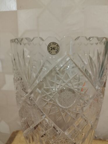 Kristal vaza – 24% PbO (ağır kristal) - Material: 24% qurğuşun oksidli kristal (etiketdə “Cristal au Plomb 24%” qeyd olunub) - Dizayn: əl işinə bənzər dərin kəsim ornamentlər – ulduz və romb motiv...