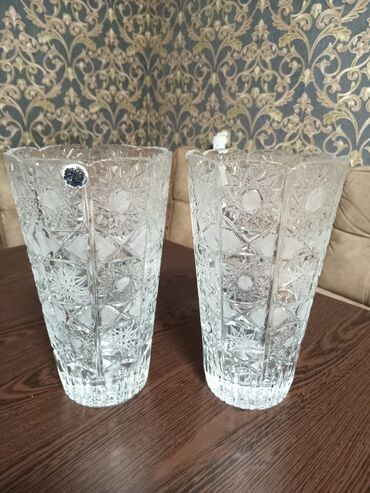Məhsul: Kəsimli büllur vazalar (2 ədəd) - Material: qalın, şəffaf büllur - Dizayn: əl işi üslubunda kəsimlər – romb şəbəkə, ulduz və çiçək motivləri, parıltını gücləndirən çoxüzlü relyef - Forma: ...