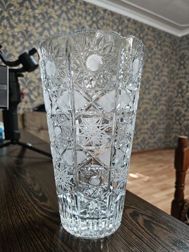 Kəsimli şüşə vaza - Material: qalın, şəffaf şüşə (kristal tipli kəsimlərlə) - Dizayn: əl işi oyma/kəsim naxışlar – ulduz və romb motivləri, işığı gözəl əks etdirir - Forma: aşağı hissəsi dar, yuxa...