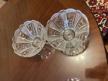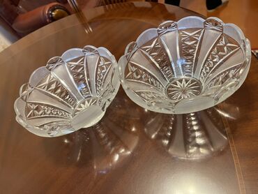 Kəsimli şüşə meyvə/qənnadı qabı - Material: qalın, şəffaf şüşə, klassik kəsim naxışlı - Forma: dairəvi, dalğalı kənarlı - Dekor: yarpaq və ulduzvari ornamentlər, işığı gözəl sındırır - İstifadə: m...