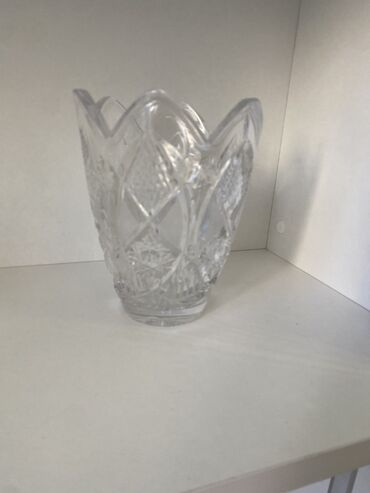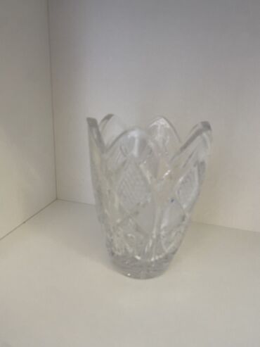 Kəsim naxışlı kristal vaza - Material: qalın, şəffaf kristal şüşə - Dizayn: əl işinə bənzər dərin kəsimlər, romb və ulduzvari ornamentlər; yuxarı hissə dalğalı kənarla - Forma: aşağıdan enli dayaq...