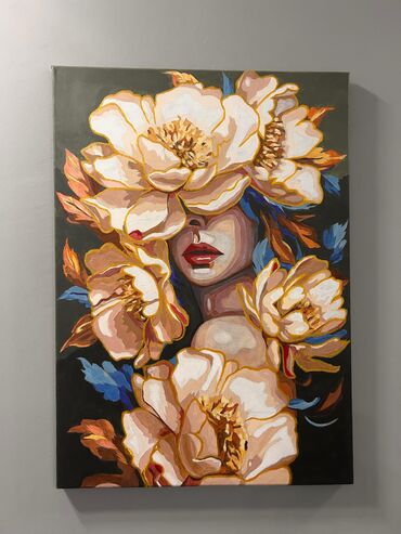 - Mövzu: Qadın portreti və iri çiçəklər kompozisiyası