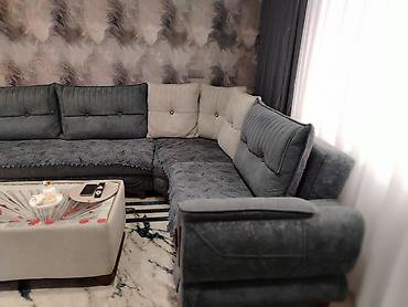 Künc divan – 899 AZN - Müasir dizaynlı, L formalı künc divan dəsti - Yumşaq, toxuması zərif boz parça üzlük - Yüksək arxalı və geniş oturacaqlar, əlavə bel yastıqları - Taxta karkas və möhkəm, qar...