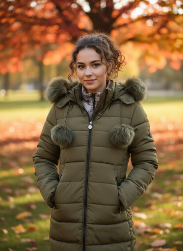 Qadınlar üçün qışlıq puf şişmə qısa gödəkçə - Rəng: karamelli/boz-qəhvəyi - Ön hissədə tam uzunluqlu fermuar - Həcimli, çıxarıla bilən natural tülkü tük/qürkü xətli kapüşon - İstini saxlayan quilt...