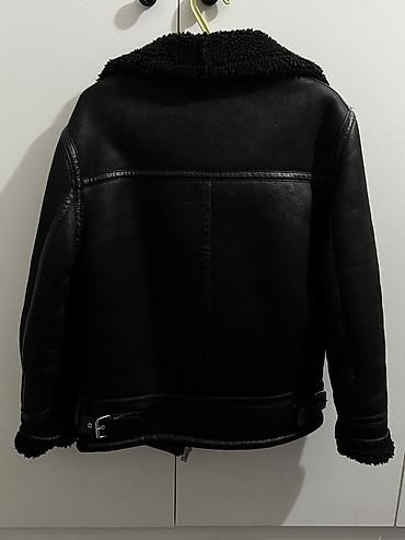 Bershka kişi gödəkçəsi – aviasiya stilində - Rəng: qara, kontrastlı krem rəngli süni xəz (shearling) yaxalıq və daxili. - Bədən materialı: dərimsi tekstura (PU tipli), yüngül parıltılı səth. - Ölç...