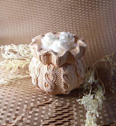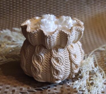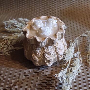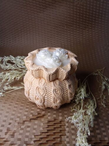 Dekorativ aromaterapiya dəsti - Tərkib: 1 ədəd qapaqlı qab (ağ qapaq), 1 ədəd naxışlı şam qabı/gips (torşəkilli faktura), 1 ədəd dairəvi qabın içində gül formalı dekorativ şam, hamısı üçün oval se...