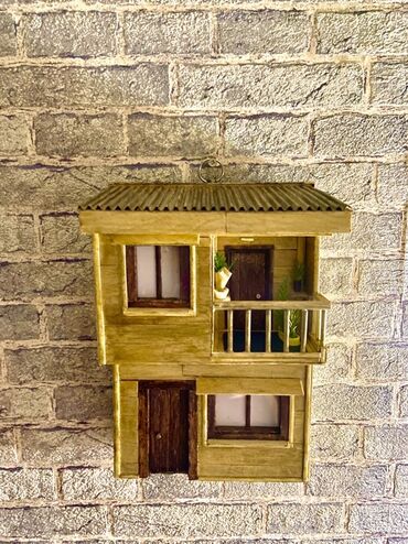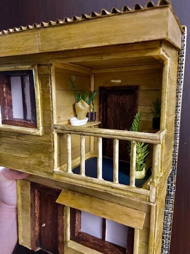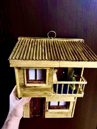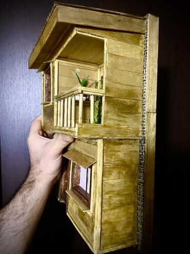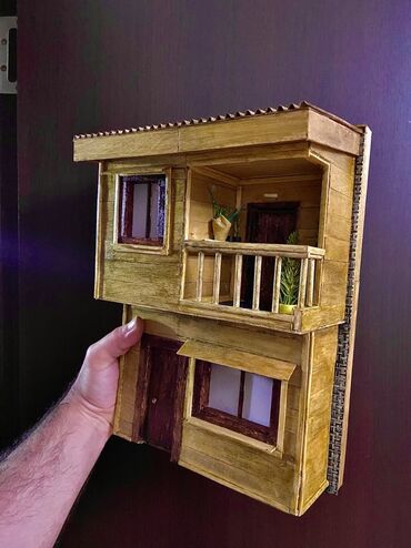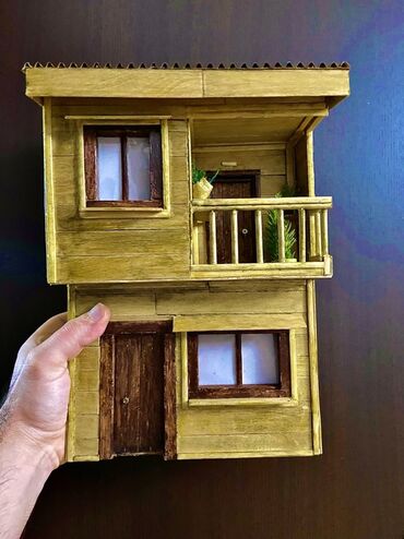 Əl işi miniatür ev modelləri. Bu modellər taxta və digər təbii materiallardan hazırlanmışdır. Hər bir modelin özünəməxsus dizaynı və detalları var. Birinci model iki mərtəbəli, taxta divarlı evdir....