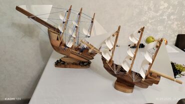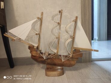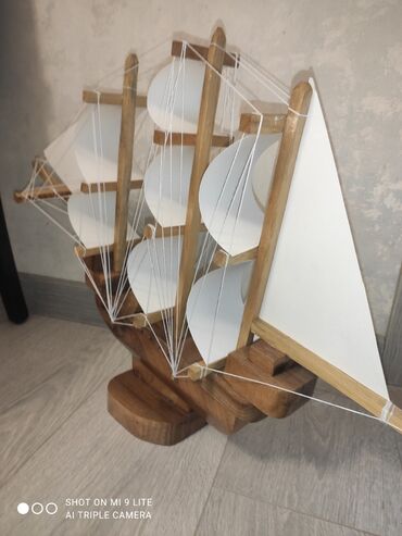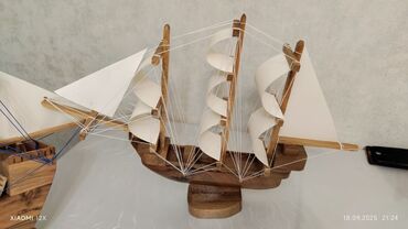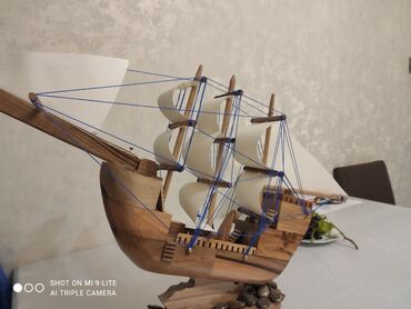 - Material: təbii ağac (gövdə və dirəklər), ağ rəngli yelkənlər, dekorativ iplər (ağ və mavi).
