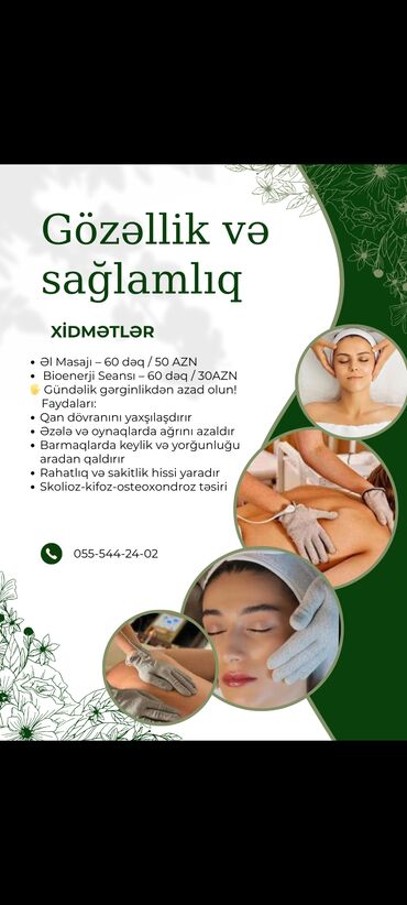 Salam eziz massaj sevenler! Sizleri mualicevi profisional massaja, ostrexoundoz massajina, vakum massajina, relax massajina, paravertebral massajina,reflektör massajina ve s devet edirem. 40 deq 35...