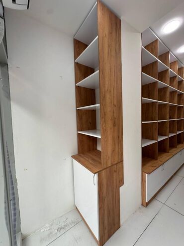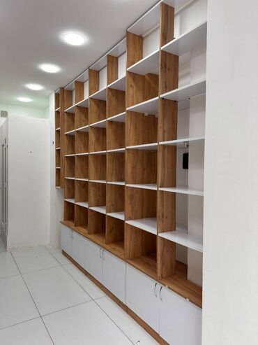 - Dizayn: iki yan divar boyunca uzanan, üst hissədə açıq bölməli rəflər, alt hissədə qapalı dolablar
