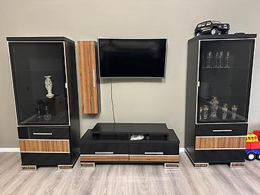• 2 ədəd şkaf-vitrin (şüşə qabaqlı) – içəridə rəflər, aşağıda çekmece və qapalı bölmələr.