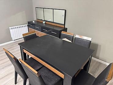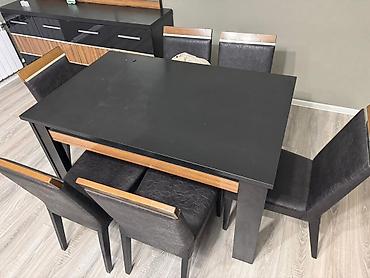 • Yemək masası + 6 ədəd stul. Masanın və stulların üzərində ağac dekor xətti, stullarda qara dəriyə bənzər oturacaq və bel hissəsi.