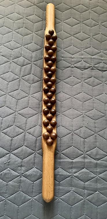 Taxta boncuklu əl masaj aləti - Material: Təbii ağacdan hazırlanmış gövdə və iki sıra tünd taxta boncuk - Quruluş: İki paralel boncuk zolağı fırlanaraq dərini və əzələləri masaj edir; ucları oyma ...