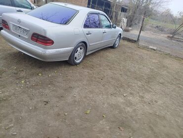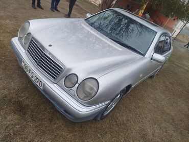 Mercedes-Benz E-Class (W210) sedan - Kuzov: sedan, gümüş rəng - Mühərrik: benzin ehtimalı (E-Class W210), önqapı havalandırma ızgaralı klassik dördyuvarlaq fara dizaynı - Transmissiya: avtomat (mə...