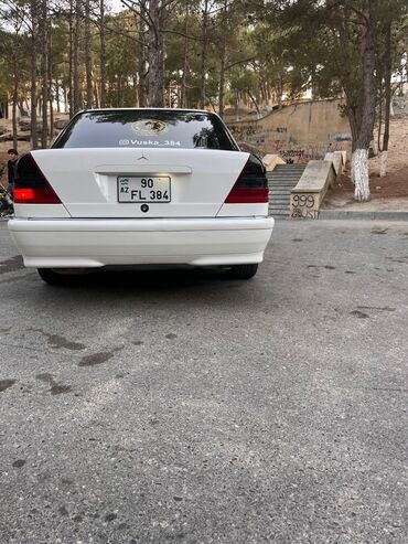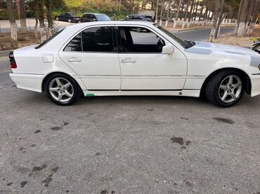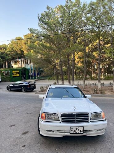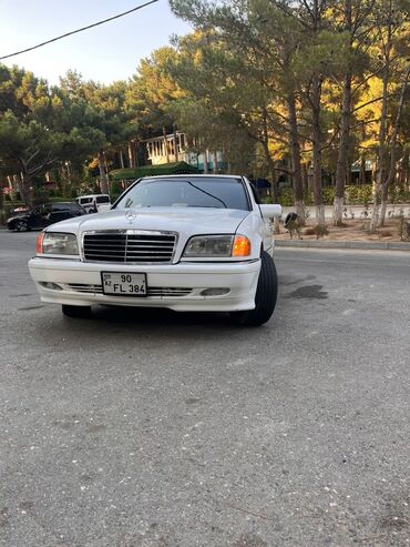 Ağ rəngli sedan, klassik Mercedes dizaynı. Xaricdən idman üslublu kuzov dəsti və 5 qol ulduz disklər, qırmızı kaliprlər, tündləşdirilmiş arxa fənərlər. Geniş salon: qara-parça və eko‑dəri oturacaq örtüləri qırmızı tikiş vurğuları ilə, arxa sırada üç nəfərlik rahat oturma. Ön panel orijinal üslubda, çoxfunksiyalı mərkəzi konsol, avtomatik ötürmənin seçici qolu, taxta dekor elementləri. Elektrik şüşəsistemləri, kondisioner bloku, istehsalçı sükanı. Qara döşəmə xalçaları qırmızı haşiyə ilə. Arxa şüşədə günəşqoruyucu plyonka və dekorativ stiker. Nizami proporsiyalı gövdə, aerodinamik yan ətəklər, aşağı oturuş, iri təkərlər. Şəhər və magistral üçün rahat, klassik W202 xətti estetikası ilə seçilən dördqapılı avtomobil.