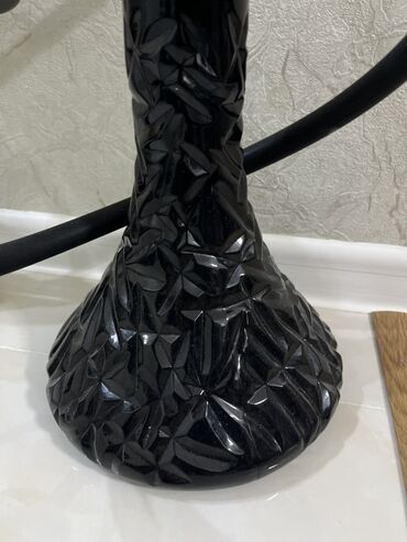 Şüşə kolba və qara dekorativ gövdə ilə nargilə - Material: qalın, şəffaf şüşə kolba; metal gövdə (naqişli/qravüralı dizayn), mat qara boşqab. - Şlanq: çevik silikon şlanq, eyni üslubda metal ağızl...