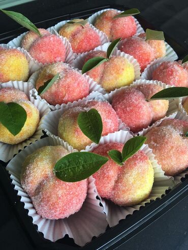 Meyvə formasında biskvit desertlər - Şaftalı və armud formasında