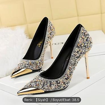 - Detallar: Kənar boyunca incə daşlarla kontur vurğusu, yanlardan tam örtülü bəzək, sabit və parlaq topuqla balanslı duruş.