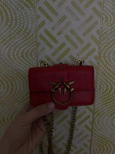- Model 2: Qırmızı mini çanta. Ön qapaqda qızılı tonlu quş fiqurlu metal dekor və halqa detallı bağlama. Qızılı rəngli metal zəncirli qayış, çiyin və ya crossbody daşımağa imkan verir. Yığcam daxili bölmə.