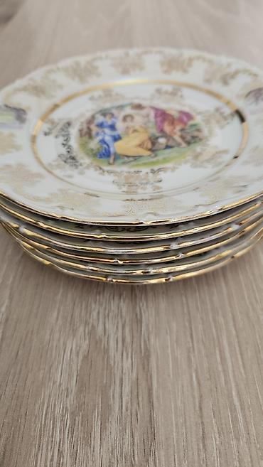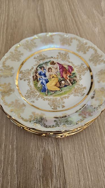 Mətbəx və süfrə aksesuarları dəsti - Porseleyn boşqablar dəsti: klassik naxışlı, mərkəzdə pastoral səhnəli dekor. Kənarları relyefli gümüşü bəzəklə. Müxtəlif ölçülü yemək və desert boşqabları, şor...