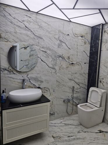 - Hamam/tualet: döşəmə və divarlar boyunca iri ölçülü mərmər effektli kafel, müasir asma tavan işıqlandırması, dairəvi güzgü, qara stolüstü ilə vannaoğlan dolabı, osmanlı tipli unitaz və bide duşu.