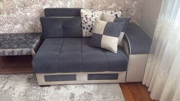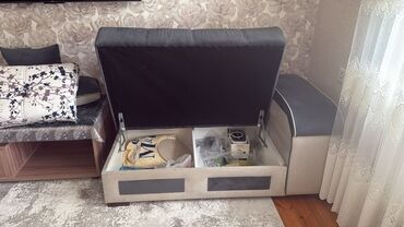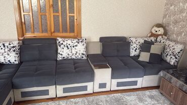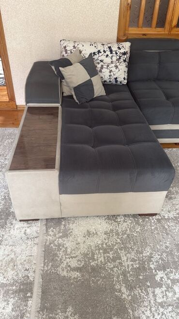 - Komplekt: böyük künc divan, ayrıca kreslo tipli modul və mərkəz hissədə mərmər naxışlı üstə malik TV/çay masası stolu