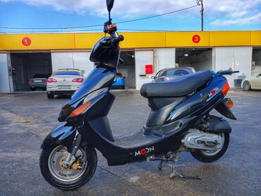 Skuter – şəhər üçün praktik və qənaətcil iki təkərli - Marka/model: Moon (stiker üzərində “MOON” yazısı) - Korpusu mavi-qara rəngdə, idman üslublu ön panel və faralar - Moped tipli avtomat ötürücü...