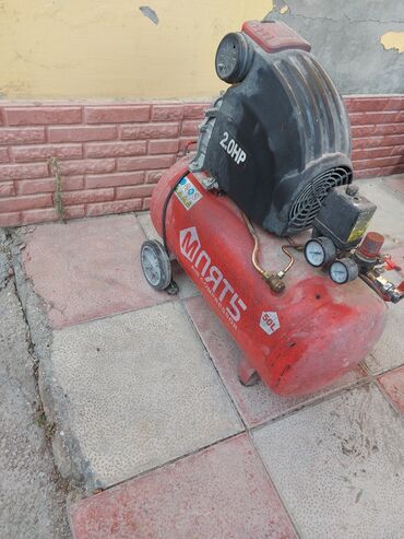 Sənaye tipli hava kompressoru - Üfüqi, tək silindrli kəmər ötürücülü sistem - Qırmızı metal hava balonu, təxmini 50–100 litrlik tutum (kompakt atelye və qarajlar üçün uyğun) - Elektrik mühərriki (...