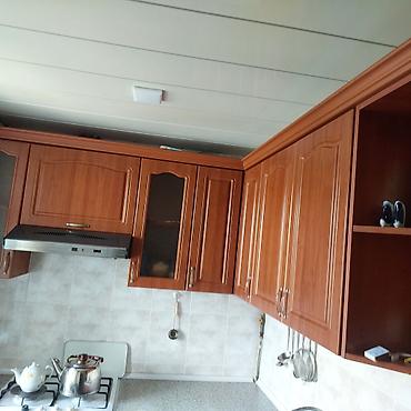 - Künc yerləşimli üst və alt şkaflar: qoz rəngli MDF/laminat fasadlar, klassik panelli qapılar, xrom tutacaqlar