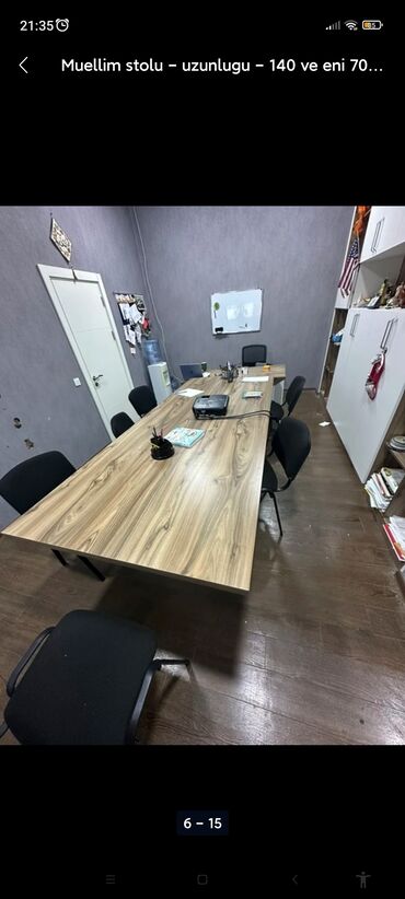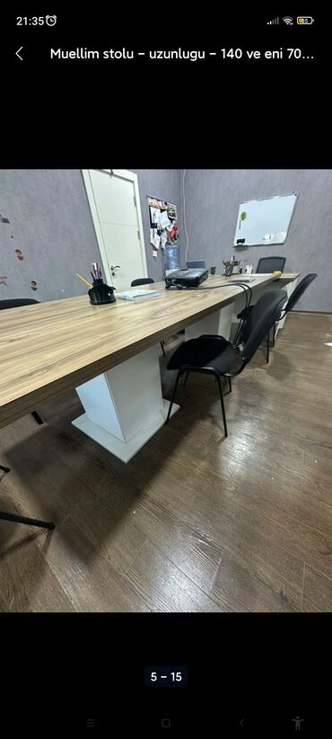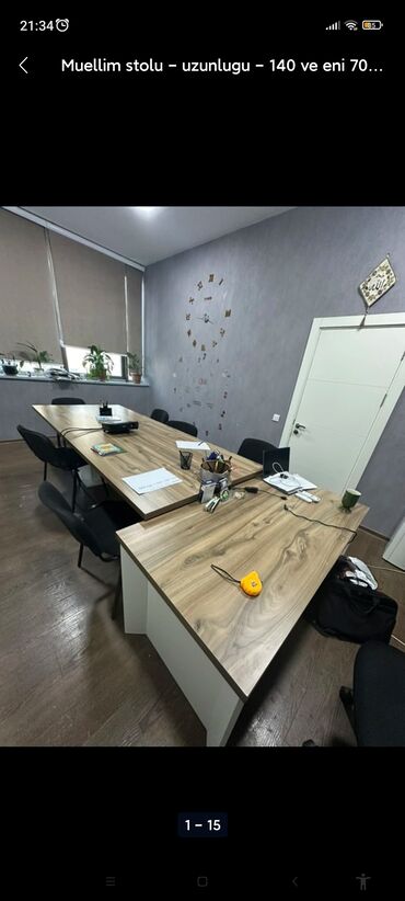 Muellim stolu - uzunlugu - 140 ve eni 70 Telebeler ucun stol - uzunlugu 270 ve eni 110 Yeni kimidir. kocle bagli satilir. 12 telebe eylese bilir