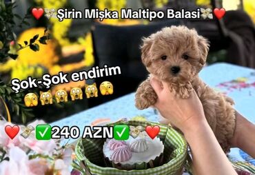 - Maltipo balaları: şəkillərdə “Şirin Mişka Maltipo Balası – 240 AZN” və “F1 Maltipo Balaları – cəmi 199 AZN” qeyd olunub. Kiçik ölçülü, qıvrım tüklü, qapalı məkan və ailə həyatı üçün əlverişli, mehriban və oynaq xarakterli.