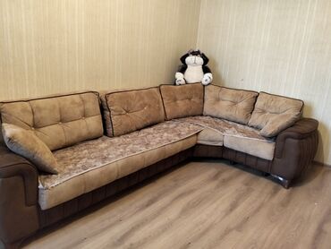 İsti bej tonları, yumşaq toxuma və erqonomik bel yastıqları ilə rahat istirahət üçün ideal künc divan.