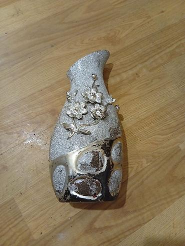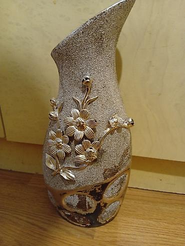 4) Dekorativ vaza – gümüşü-qara tonlarda, parıltılı tekstura. Ön hissədə relyef çiçək bəzəkləri, asimmetrik ağızlı dizayn. Daxili interyer üçün dekor elementi kimi uyğundur.